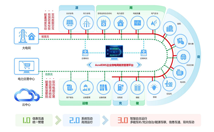 簡介:1.概述 通過在源、網(wǎng)、荷、儲、充的各個關(guān)鍵節(jié)點安裝監(jiān)測、分析、保護、治理裝置, 通過高性能邊緣計算網(wǎng)關(guān)采集數(shù)據(jù)并上傳至企業(yè)微網(wǎng)平臺。平臺根據(jù)新的電網(wǎng)價格、 用電負(fù)荷、電網(wǎng)調(diào)度指令等情況,調(diào)整各系統(tǒng)控制策略并遠(yuǎn)程下發(fā),使企業(yè)微電網(wǎng)始終高效穩(wěn)定運行, 降低企業(yè)用電成本,實現(xiàn)能源互聯(lián)、信息互動。 2.應(yīng)用場所 適用于各行業(yè)企業(yè)內(nèi)部微電網(wǎng)管理系統(tǒng)的新建、擴建、改建等項目。 3.平臺結(jié)構(gòu) 3.平臺功能 安科瑞AcrelEMS企業(yè)微電網(wǎng)能效管理平臺融合了電力監(jiān)控、電氣安全、照明控制、能源管控、充電樁運營管理、分布式光伏監(jiān)測、儲能管理、設(shè)備臺賬、運維管理等功能,通過一個平臺、一個APP整體的對企業(yè)用電進行集中監(jiān)控、統(tǒng)一調(diào)度、統(tǒng)一運維,并且根據(jù)當(dāng)?shù)毓╇姴块T錯峰避峰計劃提前為企業(yè)制定錯峰避峰方案和預(yù)警,滿足企業(yè)
